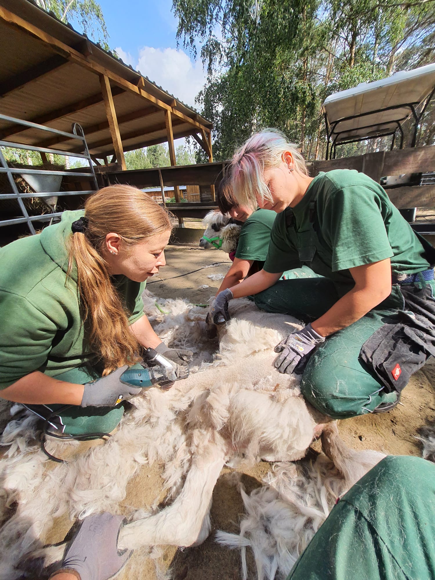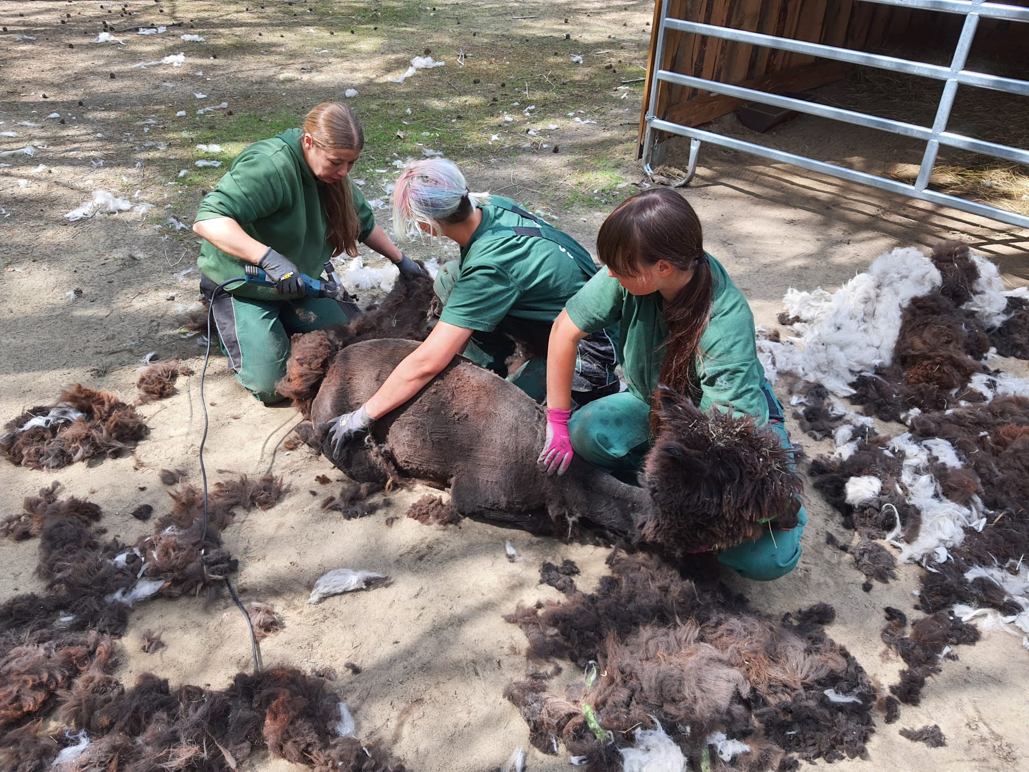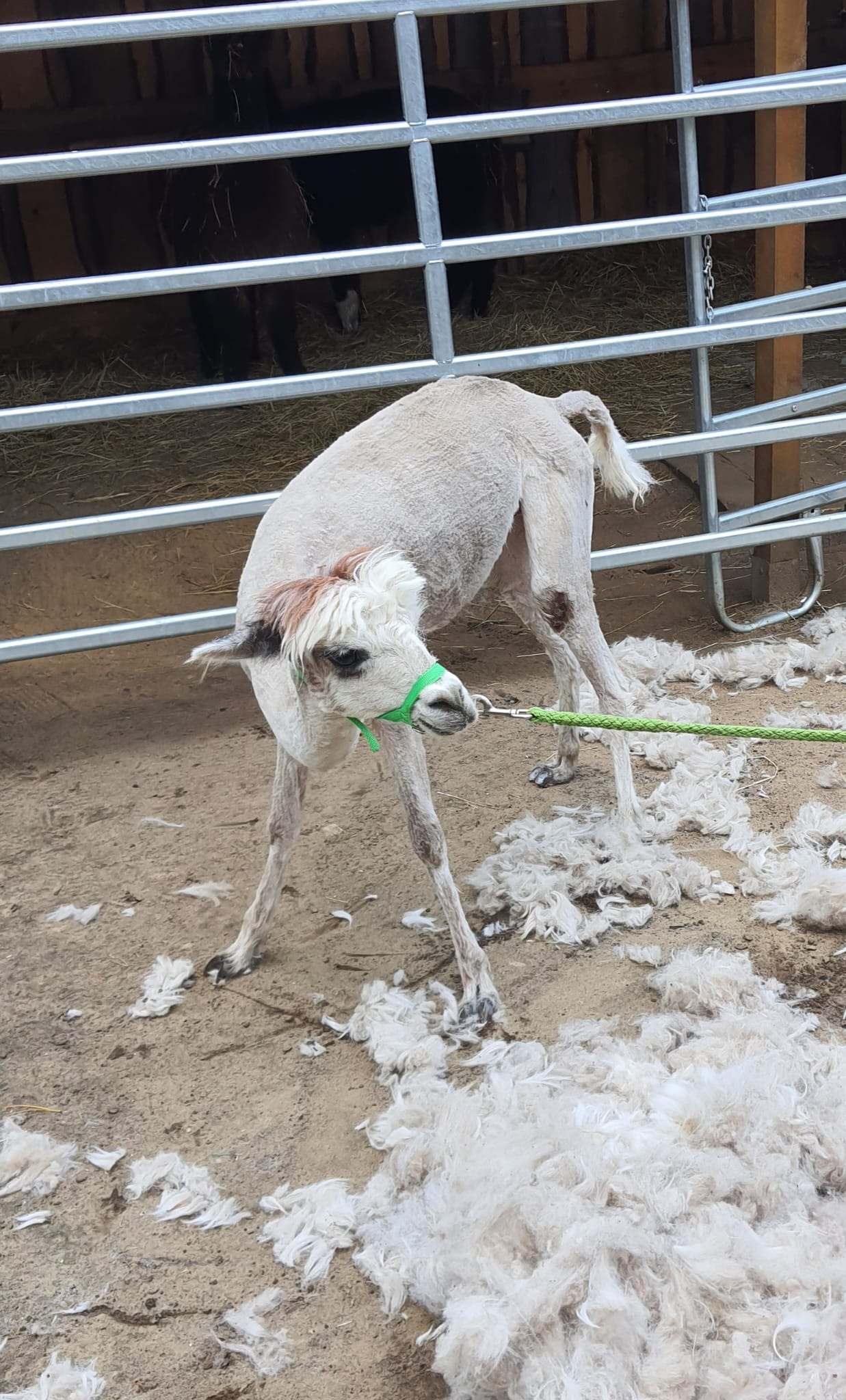 Das Wochenende wird sommerlich, und rechtzeitig fand nun auch die jährliche Alpaka-Schur statt. Da die wolligen Neuweltkamele selten freiwillig zum „Friseur“ gehen, war ordnungsgemäßes Fixieren durch Facharbeiterin und Auszubildende notwendig, damit dann auch sachgerecht die immer wieder beeindruckende Wollmenge von unserem Hengst und seinen 2 Stuten herunter geschoren werden konnte.