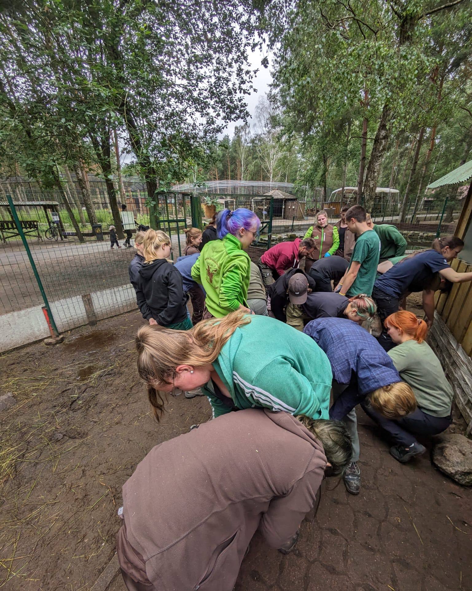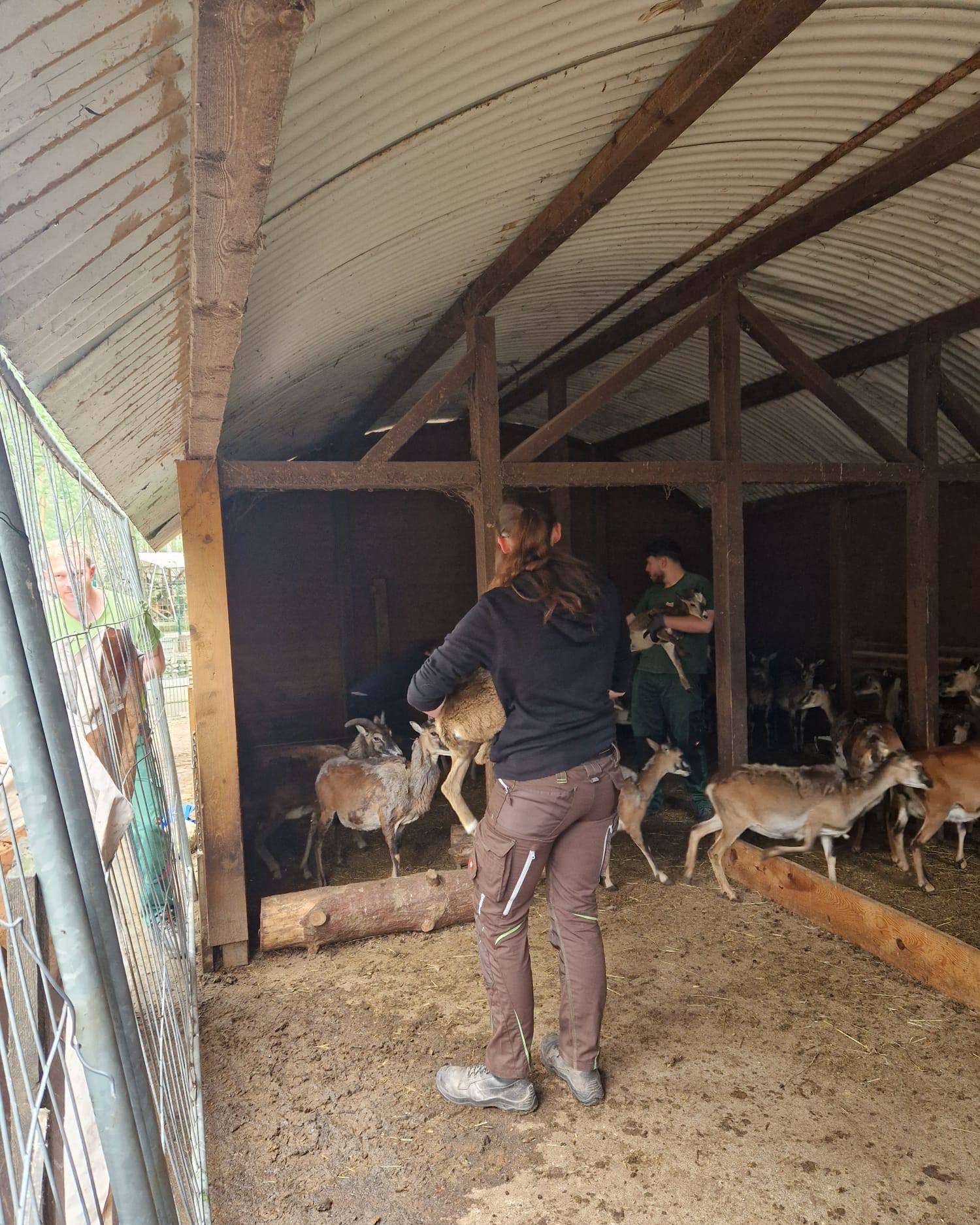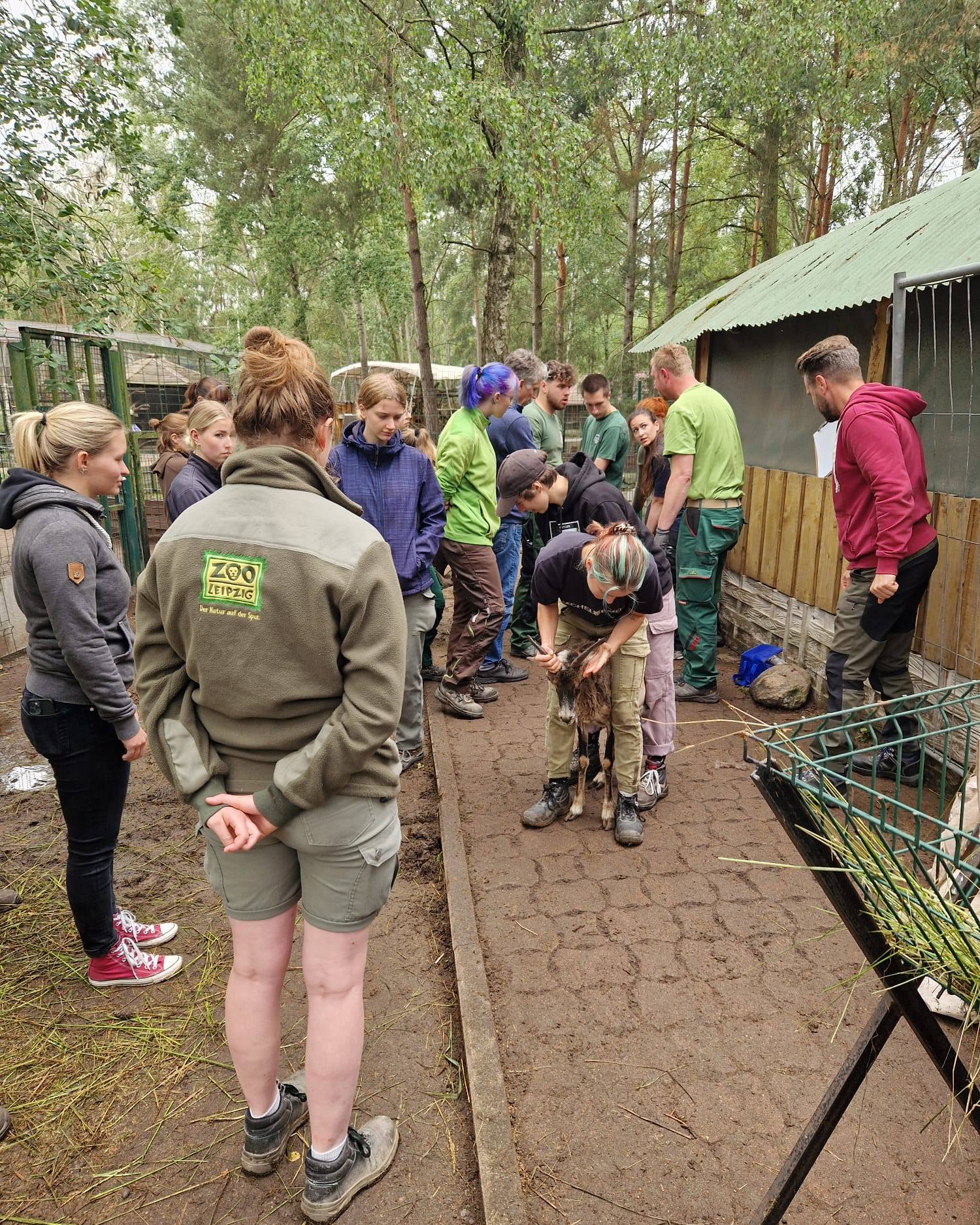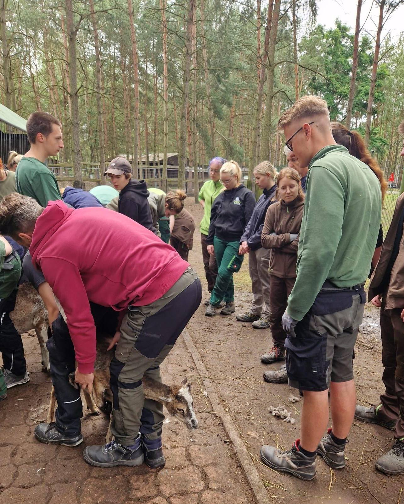Um dies nicht nur theoretisch in der Berufsschule vermittelt zu bekommen, sondern auch wirklich unter fachkundiger Anleitung und Begleitung in der Praxis durchführen zu können, unterstützten uns in dieser Woche 20 Auszubildende des 2. Lehrjahres der Fachklasse ZOO der Tierpflege der Peter-Lenné-Schule (Oberstufenzentrum Natur und Umwelt) bei der turnusmäßigen Klauenkorrektur bei unserer Mufflonherde.