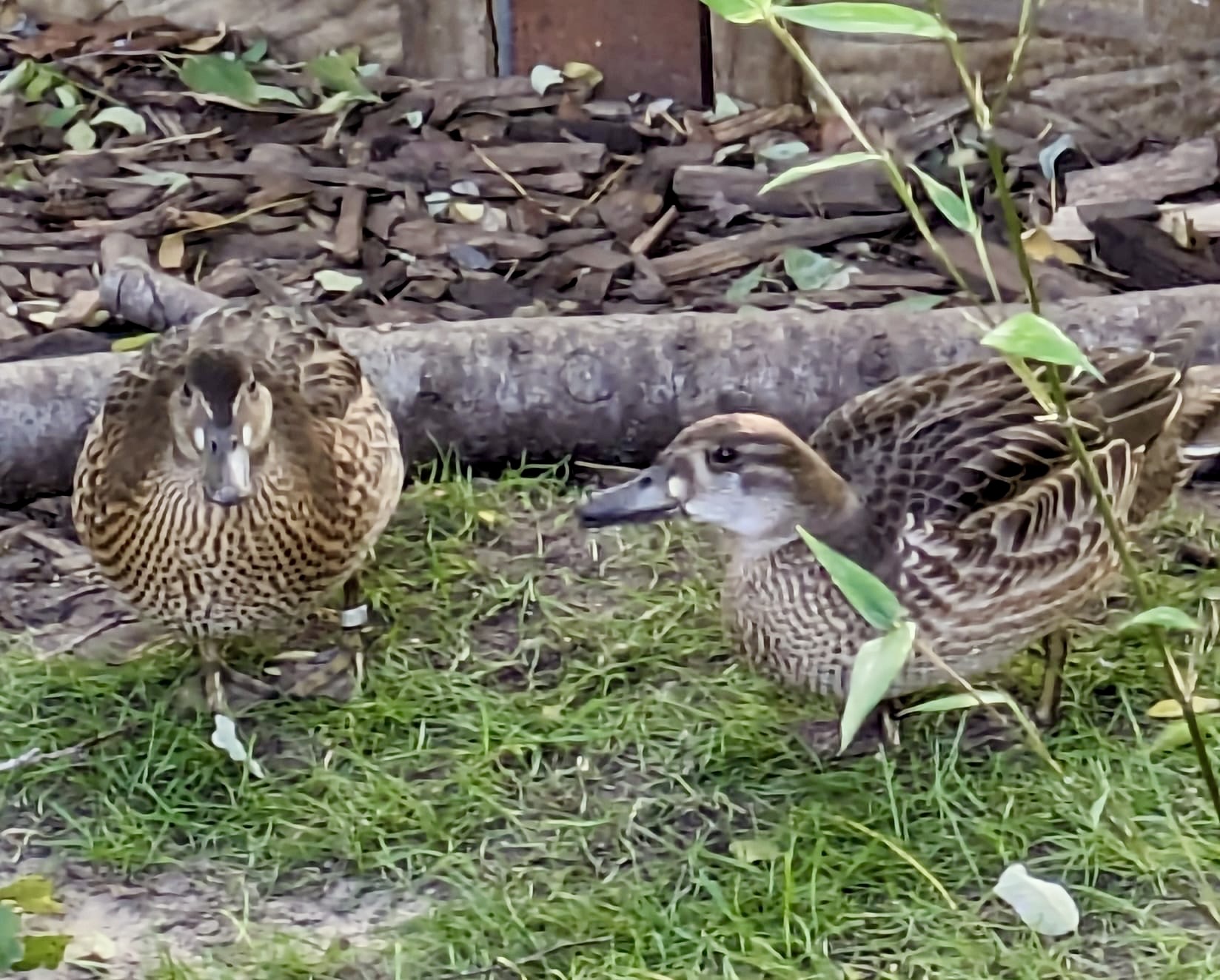 In der gleichen Anlage sind dank engagierter Wassergeflügelzucht zusätzlich Baikalenten als Neuzugang zu sehen. Die Erpel dieser auch Gluckente genannten Bewohners von Sibirischen Flussläufen, der im südlichen China und Japan überwintert, sind in Zeichnung und Farbenpracht besonders attraktiv anzusehen. Noch sind unsere Vögel allerdings in das unscheinbare Jugendgefieder bzw. Ruhekleid gehüllt, mit dem sie bedeutend besser getarnt und damit noch sicherer vor möglichen Fressfeinden sind. Bis die volle Schönheit bei unseren Baikal-Erpeln zum Tragen kommt, vergeht noch die nächste Sommersaison, dann ist die Geschlechtsreife erreicht und es lohnt sich, im Werben um die Gunst der Weibchen besonders herausgeputzt zu sein.