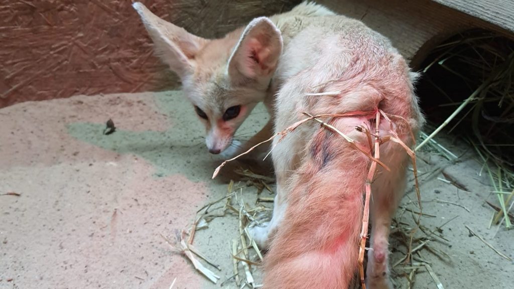 Doch unser Fennek-Rüde „Ramses“, im Mai 2023 im dänischen Zoo Skaerup geboren, liegt derzeit einsam im roten Licht seiner Rotlichtlampe. Der Platz an seiner Seite im gemütlichen Heukistchen unter der Wärmequelle ist verwaist. Im Januar verstarb unter tragischen Umständen sein gleichaltes Weibchen, mit dem er ein sehr harmonisches Paar gebildet hatte. Trotz intensiver Behandlung beider Tiere mit vielfältigen Therapieansätzen brachte leider erst die Untersuchung der Partnerin im Institut für Zoo-und Wildtierforschung (IZW) in Berlin, dass uns dankenswerterweise bei der Aufklärung von Todesfällen unserer Tierpark-Tiere sehr unterstützt, den entscheidenden Hinweis auf einen massiven Befall mit Lungenwürmen. Daraufhin konnte „Ramses“ gezielt behandelt und gerettet werden.
